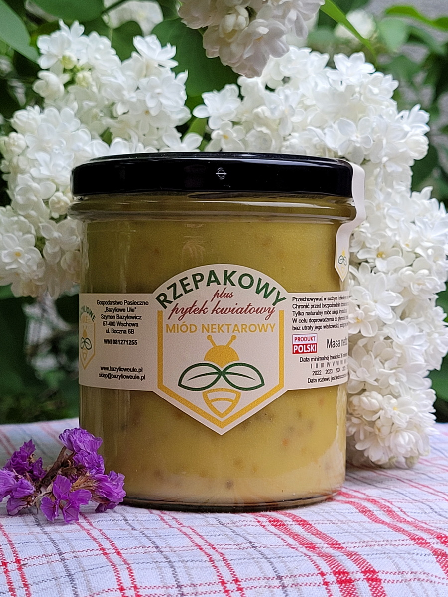 Miód rzepakowy wzbogacony pyłkiem kwiatowym to prawdziwa skarbnica zdrowia. Pyłek kwiatowy, pełen witamin i minerałów, wspomaga regenerację organizmu, wzmacnia odporność i dodaje energii. Połączenie miodu z pyłkiem tworzy wyjątkowy smak, który doskonale pasuje do śniadania, jako naturalny słodzik do napojów czy dodatek do jogurtu. To wybór dla osób, które pragną wprowadzić do swojej diety naturalne wsparcie dla zdrowia.