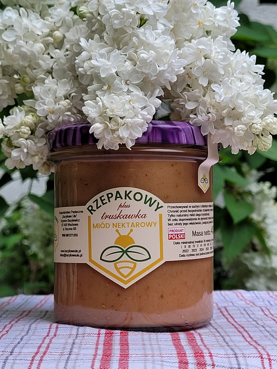 Miód rzepakowy z truskawką to połączenie naturalnej słodyczy miodu rzepakowego z orzeźwiającym smakiem truskawki, który wspiera odporność i poprawia nastrój.
